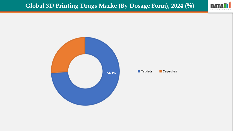By Dosage Form:The tablets segment from dosage form is dominating the 3D printing drugs market with a 54.1% share in 2024