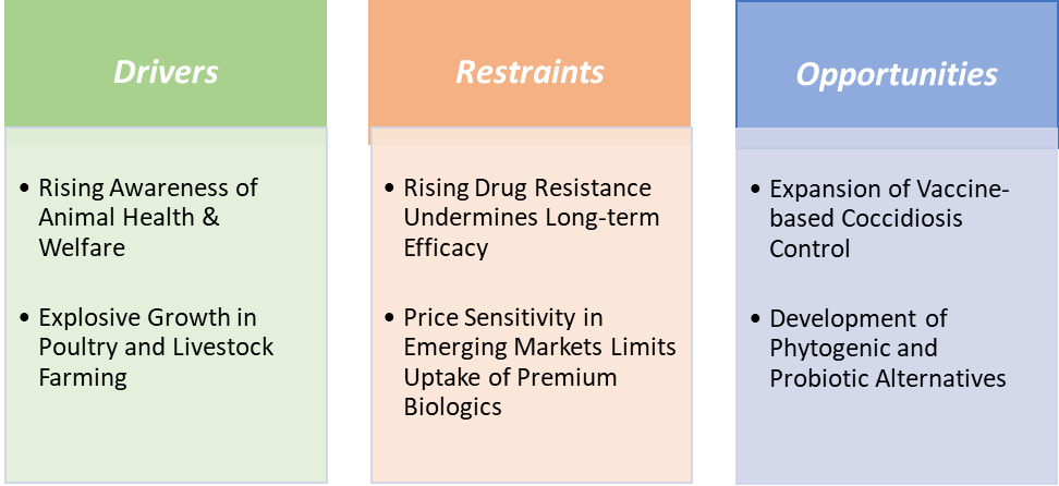 Similarly, resistance to synthetic compounds such as diclazuril and nicarbazin has been reported, limiting their long-term viability and prompting a need for integrated control programs. This escalating resistance not only increases the cost of disease management but also shortens the commercial lifespan of established drugs, discouraging investment in new molecule development, given the high R&D and regulatory costs involved.