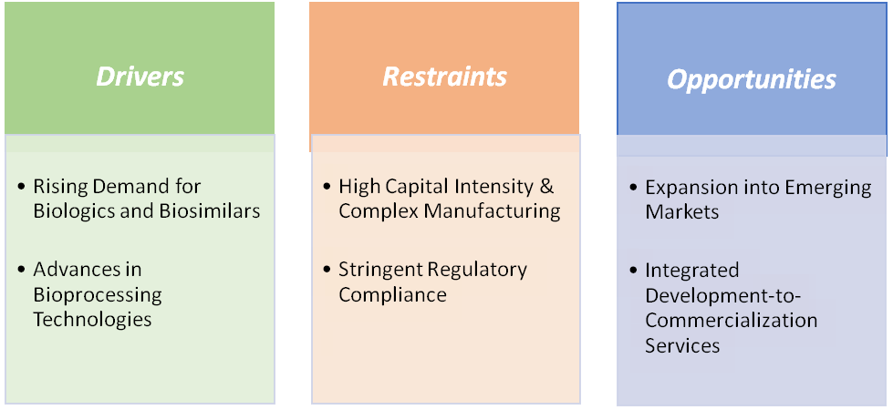 The market is expanding rapidly, driven by rising demand for novel biologics & biosimilars, advancements in bioprocessing technologies, increasing biologics approvals & biosimilar launches, and capacity expansion & integrated service models.