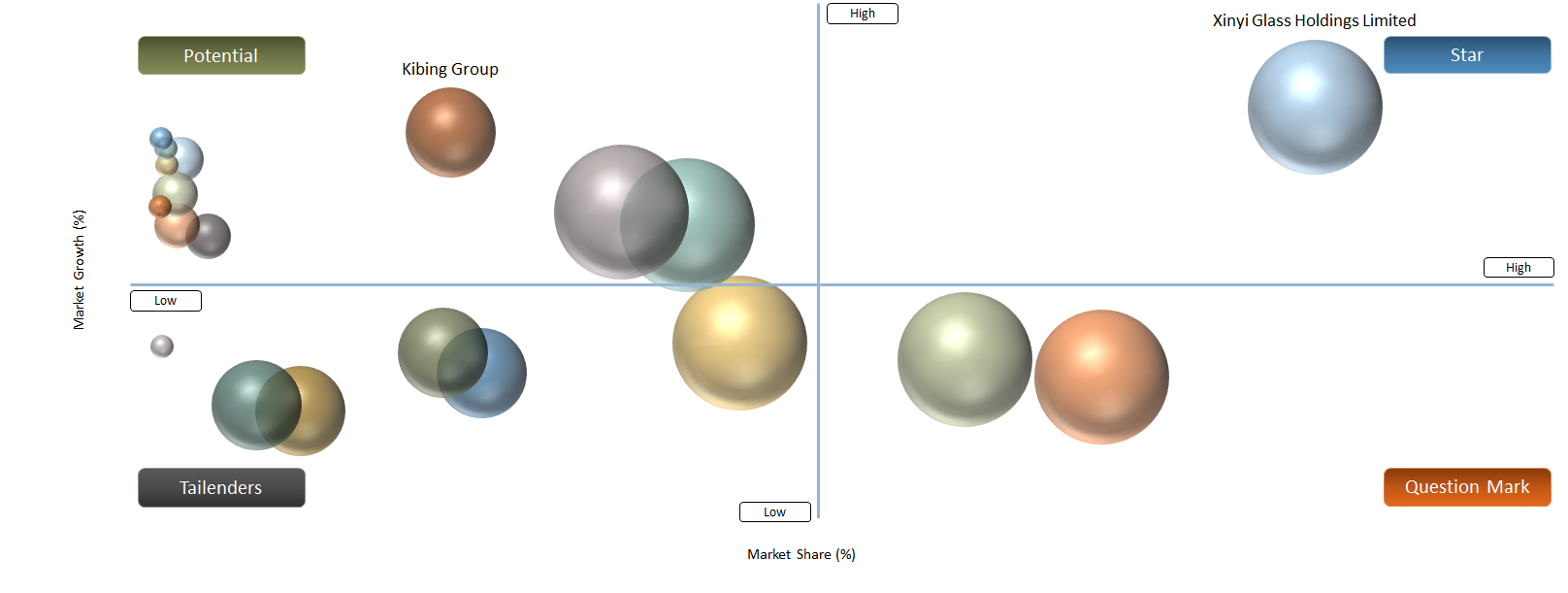 Flat Glass Group and Xinyi Glass Holdings (through Xinyi Solar) will be identified as Stars based on their leadership in photovoltaic glass capacity along with integration into module makers. Jinjing Group will be categorized as a Question Mark due to growing involvement in photovoltaic glass production with possibilities for future growth. Companies like Gold Plus Glass Industry, Kibing Group and China Glass Holding will fall under Potential companies due to ongoing expansions and regional exposure.