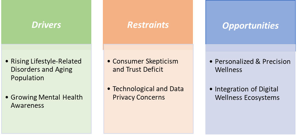 The health & wellness industry is being fundamentally reshaped by two interlinked forces such as the widespread rise of lifestyle-related disorders like obesity, diabetes, and cardiovascular conditions, and the accelerating shift in global demographics toward an aging population. As chronic conditions become more prevalent, consumers are increasingly seeking proactive, preventative solutions ranging from functional foods and supplements to diagnostics and fitness tracking to manage health before illness strikes.