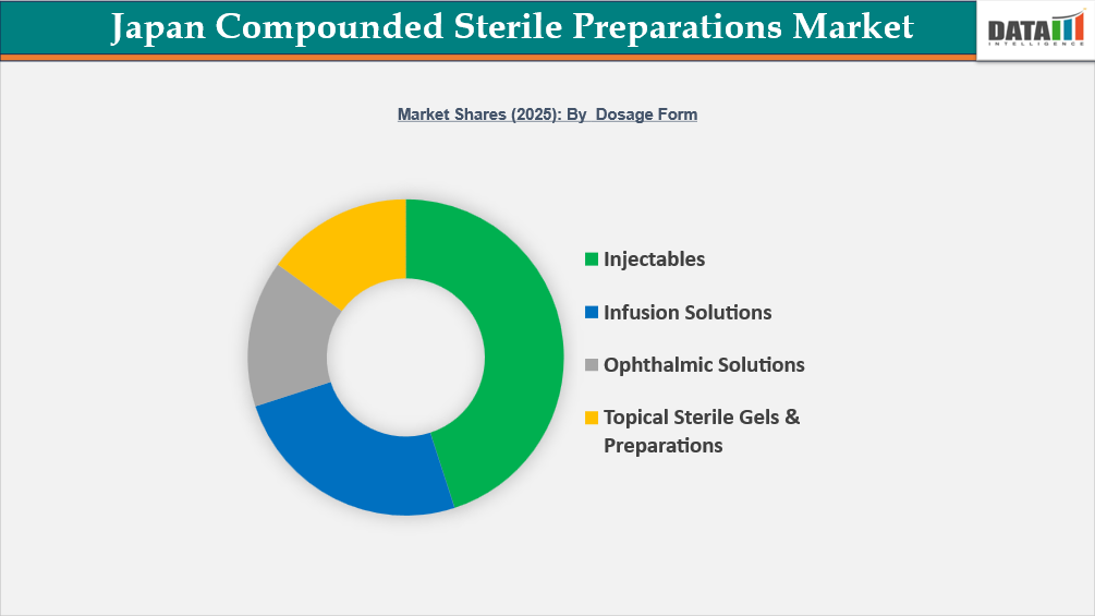 Overall, government healthcare statistics and professional survey evidence show that injectables are the most widely used sterile dosage form in Japan's hospital system, firmly retaining their leading and structurally embedded position in the country's Compounded Sterile Preparations market.