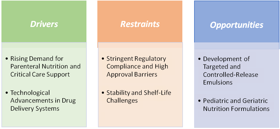 The growth of the market is being driven by the rising need for drug-delivery systems that enhance the solubility and bioavailability of poorly water-soluble drugs, alongside the expanding demand for parenteral nutrition in critical care. Widely approved products such as Intralipid and SMOFlipid (Fresenius Kabi) and ClinOleic (Baxter) highlight how intravenous lipid emulsions have become indispensable for hospital nutrition, especially in neonatal and ICU settings.