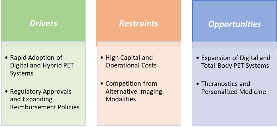 Drivers: Rapid adoption of digital and hybrid PET systems is significantly driving the positron-emission tomography (PET) market growth