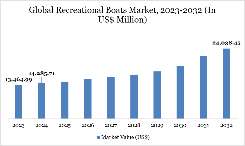 The recreational boats market reached US$14,285.71 million in 2024 and is expected to reach US$24,038.45 million by 2032, growing at a CAGR of 6.8% during the forecast period 2025-2032.