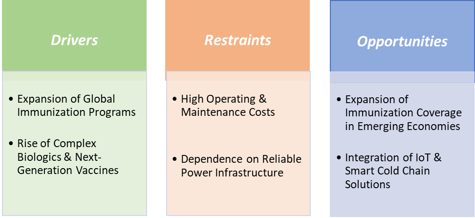 At the same time, the market faces restraints such as the high upfront and operating costs of medical-grade refrigerators, infrastructure challenges in rural areas, environmental concerns around refrigerants, and supply chain disruptions affecting component costs.